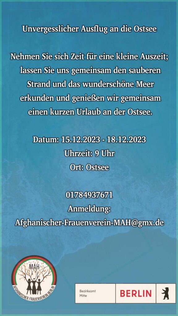 From December 15th to 18th, 2023, the Afghan women’s association Afghanischer Frauenverein MAH organized a wonderful trip to the German Baltic coast. Together, we explored this part of the country in a relaxed atmosphere.
