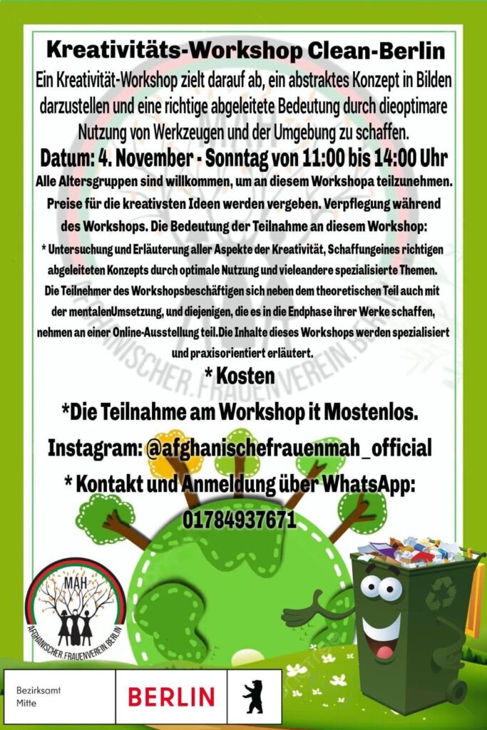 On November 4th, a free creative workshop themed “Clean Berlin” was held for all age groups. Participants explored the theory behind the topic and artistically translated their ideas. Prizes were awarded for the best projects. All finished works were presented in an online exhibition.