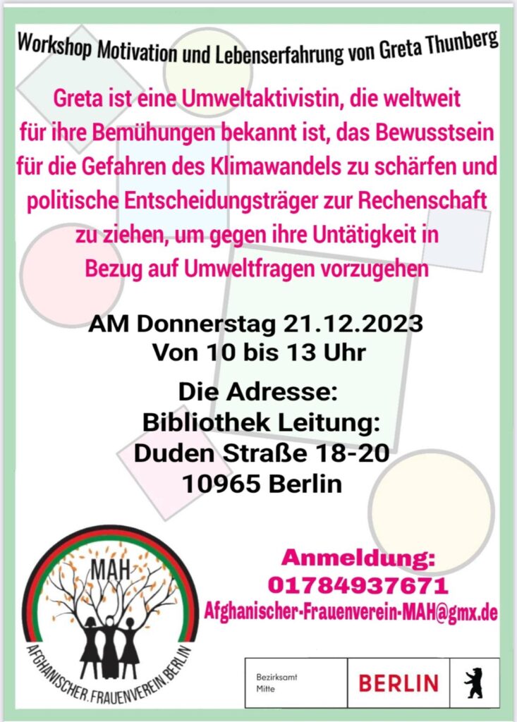 On December 21, 2023, a workshop on Greta Thunberg’s motivation and life experiences took place in the library on Dudenstrasse. Participants explored her commitment to climate protection and discussed how individual action and social responsibility interact.