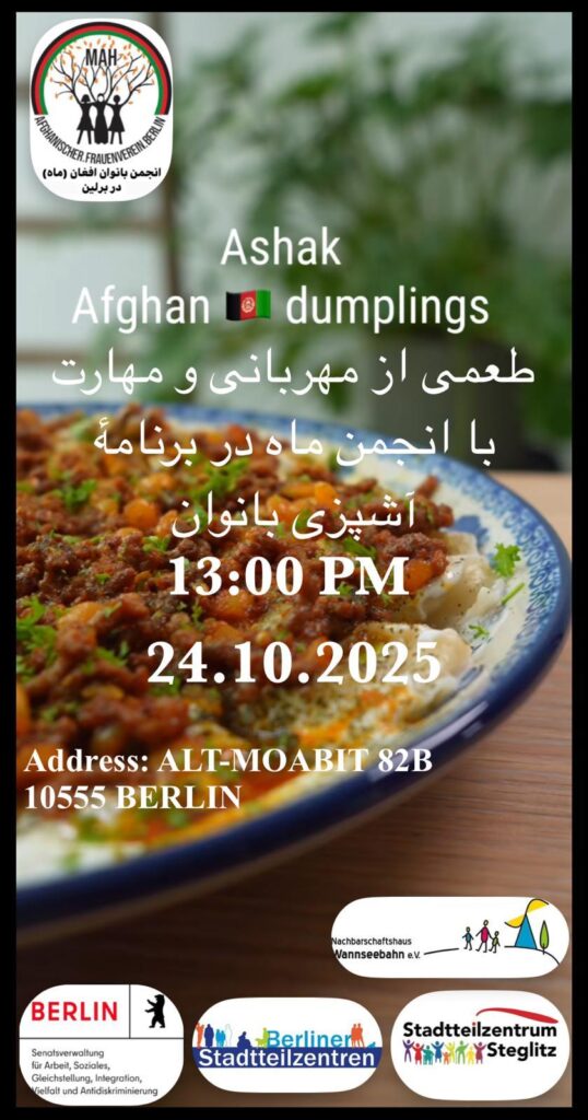 On October 24, 2025, the Afghan women’s association Afghanischer Frauenverein MAH invited people to a cooking meeting in Alt-Moabit, where we prepared Ashak, traditional Afghan dumplings, together.