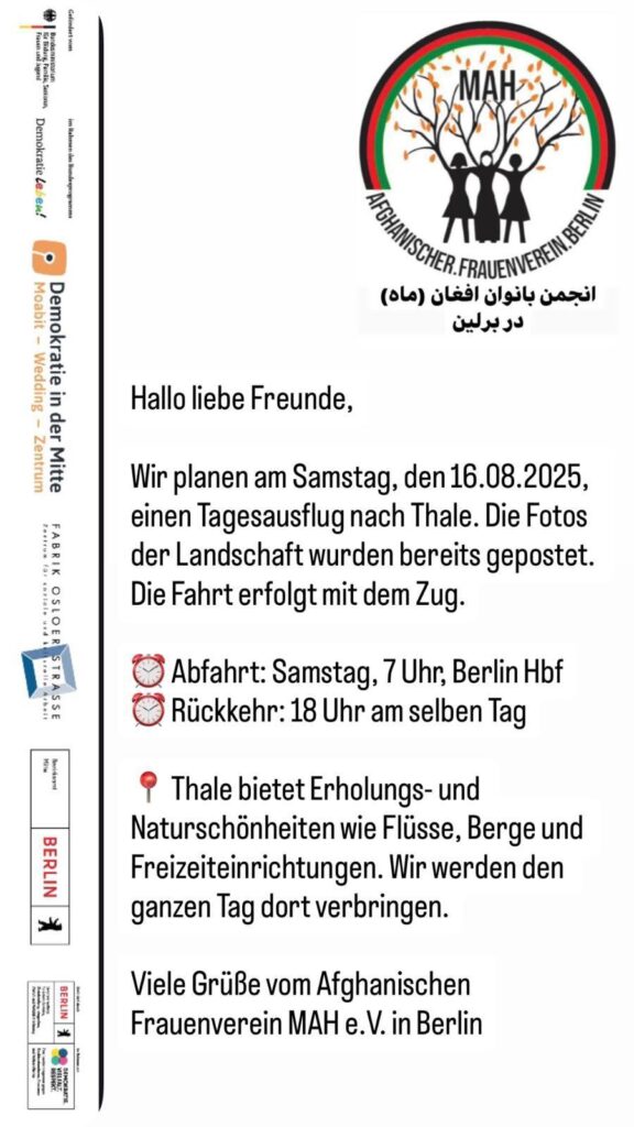 On August 16, 2025, the Afghan women’s association Afghanischer Frauenverein MAH organized a day trip by train to Thale in Saxony-Anhalt.