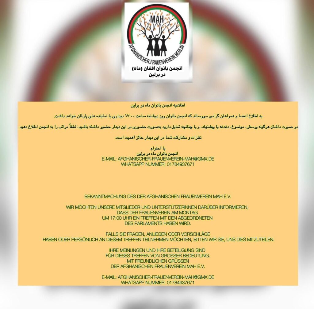 The Afghan Women’s Association MAH announces a meeting with members of parliament on Monday, January 26, 2026 at 5:00 PM in Berlin.