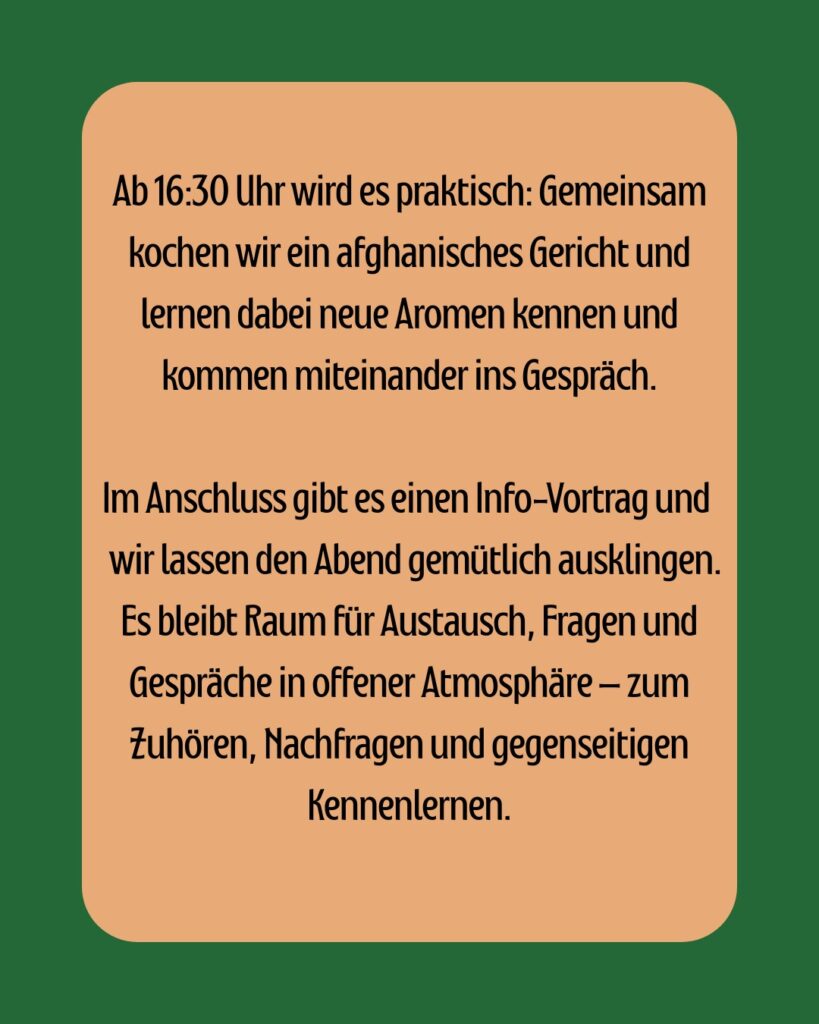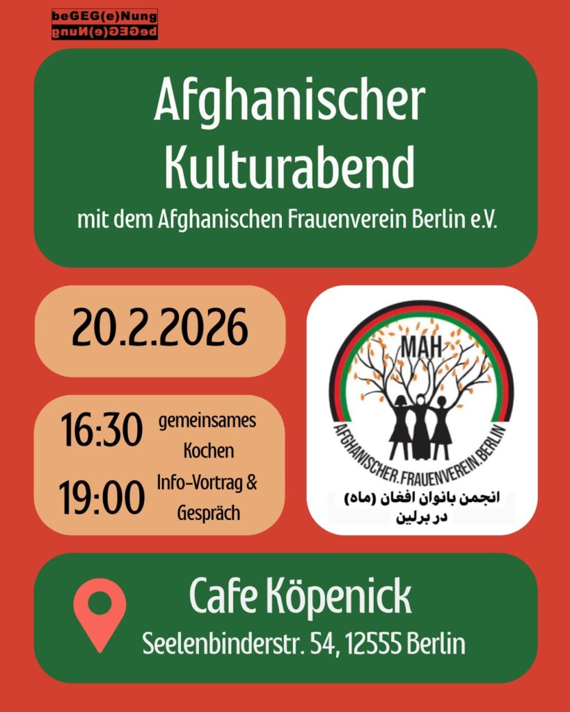 We cordially invite you to our Afghan cultural evening at Café Köpenick on February 20, 2026. Together, we will cook a traditional Afghan dish and discuss the current situation in Afghanistan.