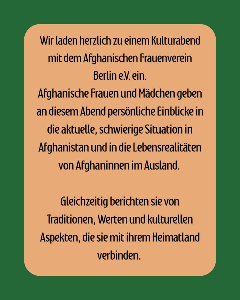 On November 14, 2025, a meeting organized by the non-profit association Interkulturanstalten Westend e.V. took place at Ulme35, where Mahdiah Hashemi, founder of the Afghan women’s association Afghanischer Frauenverein MAH, also spoke. Here are some impressions of the event.