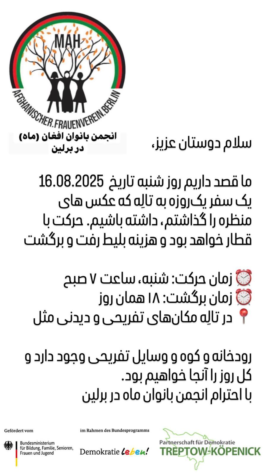 در ۱۶ آگوست ۲۰۲۵، انجمن زنان افغان MAH e.V. سفری یک روزه با قطار به تاله در زاکسن-آنهالت ترتیب داد.