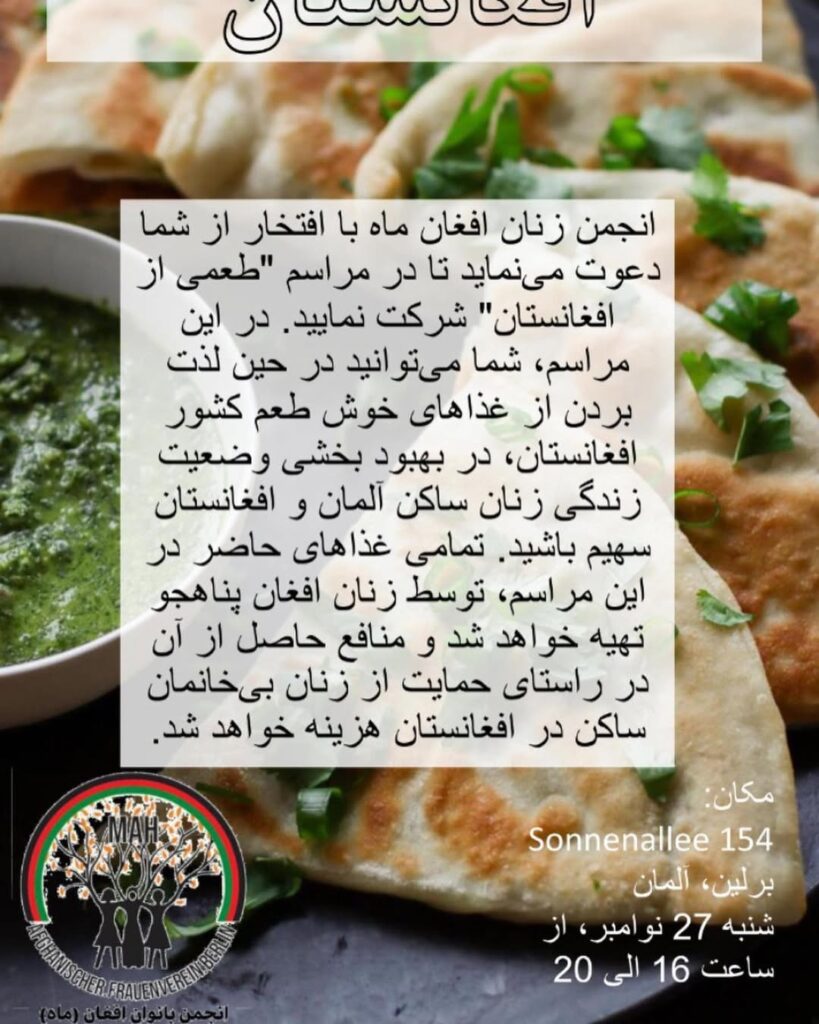 در ۲۴ اکتبر ۲۰۲۵، انجمن زنان افغان MAH مردم را به یک جلسه آشپزی در آلت-موآبیت دعوت کرد، جایی که آشاک، کوفته سنتی افغانی، با هم تهیه شد.