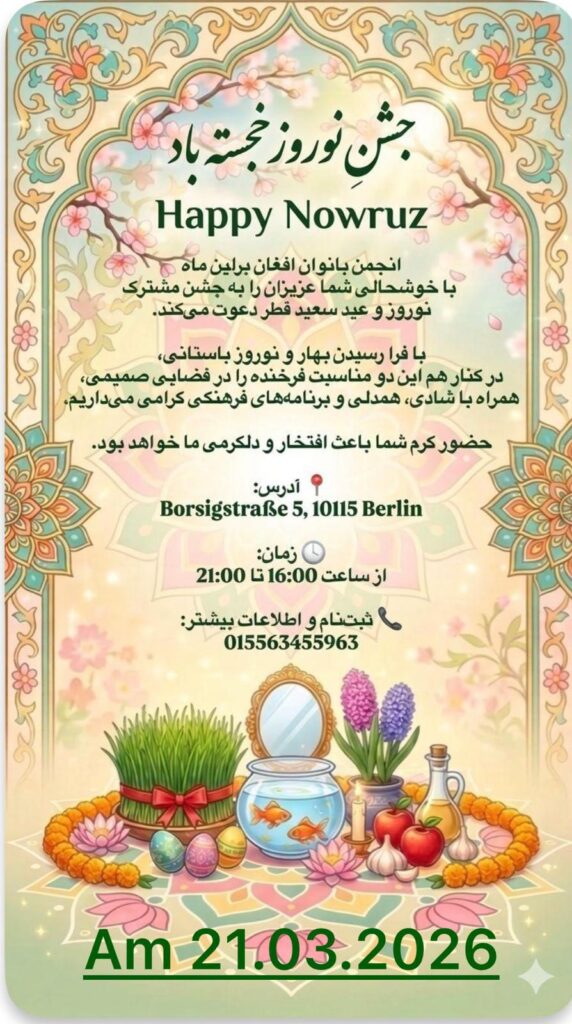 رویداد ما با عنوان «زنان داستانهای امید را روایت میکنند» در تاریخ ۶ دسامبر ۲۰۲۵، از ساعت ۱۱:۰۰ صبح تا ۳:۰۰ بعد از ظهر در خیابان فلدستراسه ۱۰ در محله گزوندبرونن برلین برگزار خواهد شد.